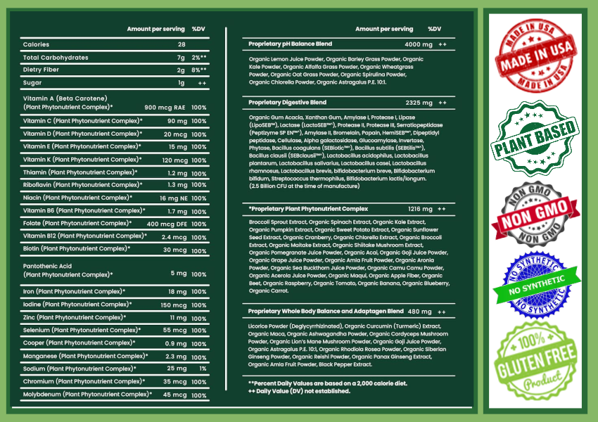 Whole-Food Nutrition: Delivers 22 vitamins and minerals, 29 fruits & vegetables, 21 plant-derived enzymes, 15 probiotic strains, and herbal botanicals for whole-body nourishment.