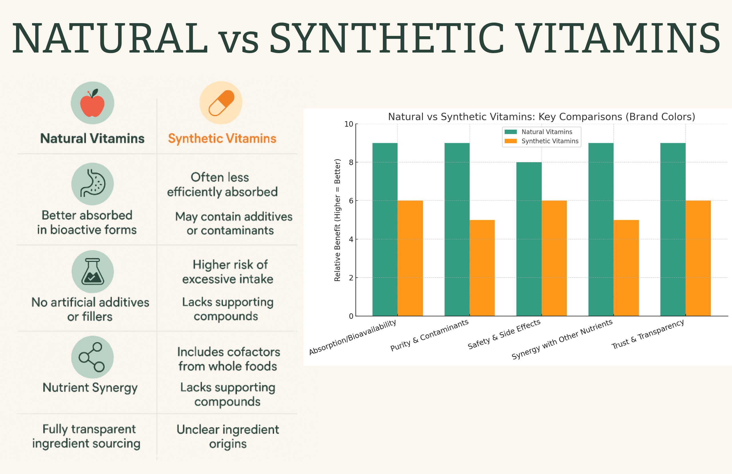 Natural vitamins, on the other hand, come from real-food sources and are structured the way your body expects them to be. They’re absorbed more efficiently, used more effectively, and often come with the natural cofactors and plant compounds that make a real difference in how you feel.